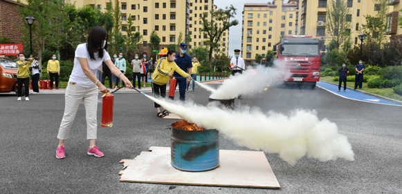 7月23日,在招遠(yuǎn)市金潮地產(chǎn)格林小鎮(zhèn)小區(qū)內(nèi),兩輛消防車??吭谠簝?nèi),消防人員整裝待命;現(xiàn)場(chǎng)擺放著數(shù)十只干粉滅火器,20余名物業(yè)工作人員和居民代表整齊列隊(duì),做好了滅火的各項(xiàng)準(zhǔn)備。這是山東永升潤(rùn)和物業(yè)公司與招遠(yuǎn)市消防救援大隊(duì)聯(lián)合舉行小區(qū)消防實(shí)戰(zhàn)演練的場(chǎng)景。