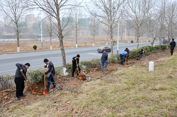 3月12日植樹節(jié)當(dāng)天,按照前期劃定的區(qū)域,金潮控股總部組織行政人事中心、財務(wù)中心,金潮新材、金潮建工、金潮地產(chǎn)公司干部員工打響了集中清理環(huán)境衛(wèi)生的突擊戰(zhàn)。在公司總部院內(nèi)及大門兩側(cè)綠化帶的大樹下、草坪及花壇等區(qū)域,參與活動的干部員工自備鐵锨、筢子、抓鉤、鎬頭、篷布、編織袋等工具,集中清理散布在其中的枯枝、落葉、雜草、塑料袋等垃圾,活動現(xiàn)場你追我趕、熱火朝天。經(jīng)過三個多小時的不懈努力,將旮旮旯旯的垃圾全部清除完畢,整個園區(qū)面貌為之煥然一新。與此同時,金潮建工園林綠化部門的員工還及時將苗木運抵現(xiàn)場,并整齊有序地擺放在相應(yīng)的位置。這一系列的前期準(zhǔn)備工作,為次日的植樹綠化創(chuàng)造了有利條件。